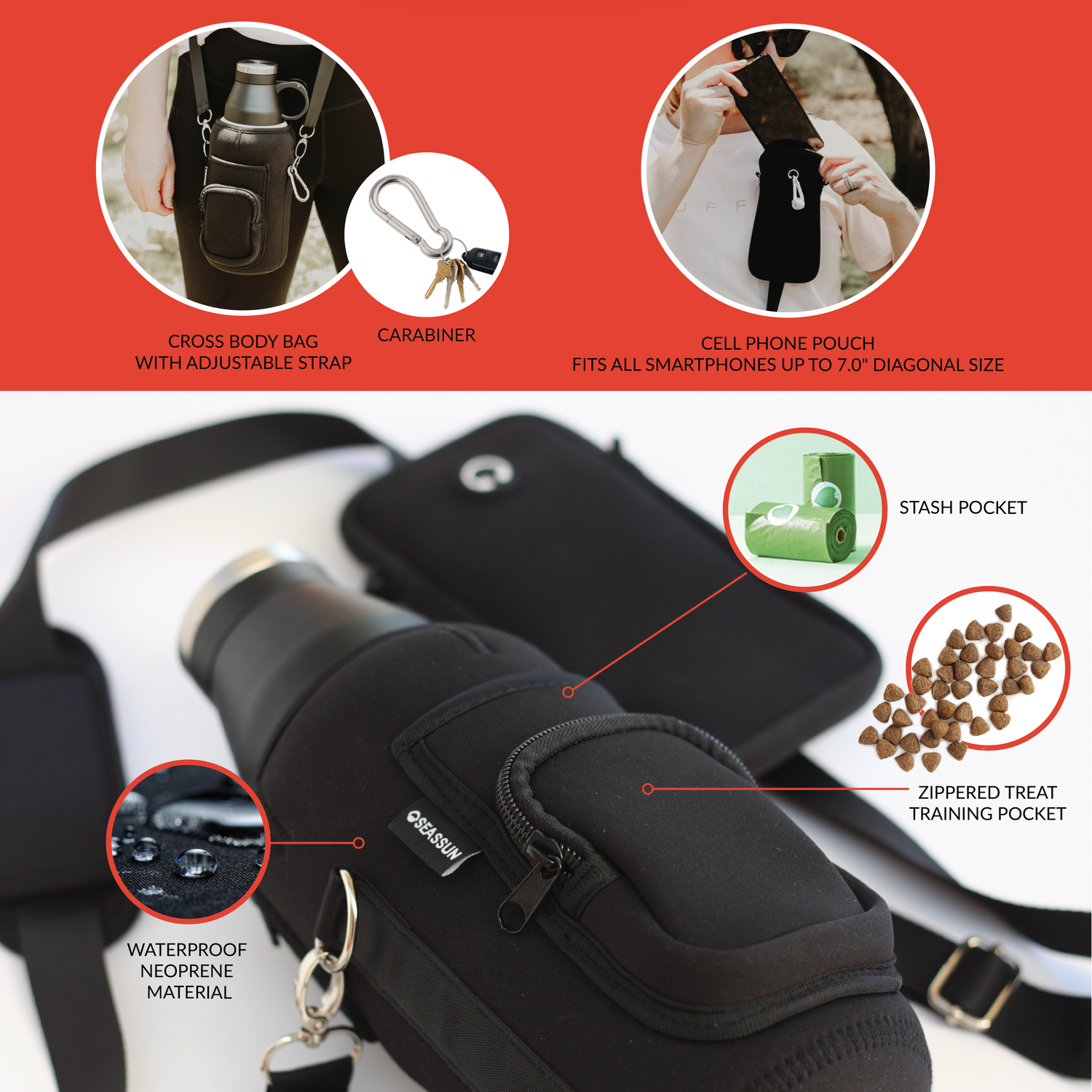 Stay hands free with the sporty neoprene bag. It fits the bottle like a glove and features an adjustable strap with phone pouch, zippered stash pocket to keep all your goodies in one spot, and is equipped with a carabiner to easily clip on your keys or doggie bags.